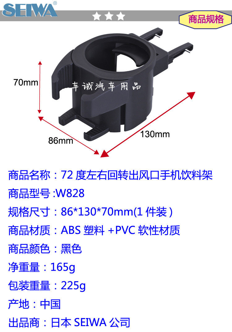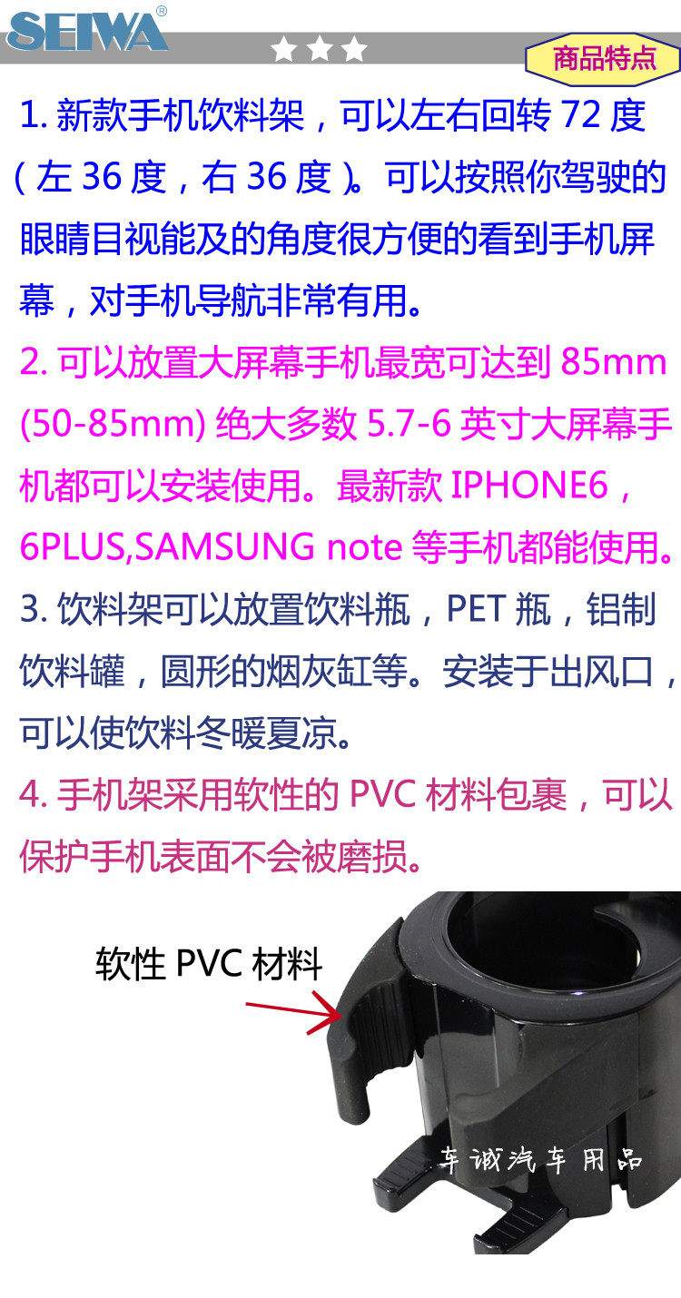 可放置5.5CM-7.5CM直径内的水杯及饮料架,放置手机的位置可放宽度不超过85MM的手机。角度调节左右各可调节36度,使用更方便,绝对结实耐用。