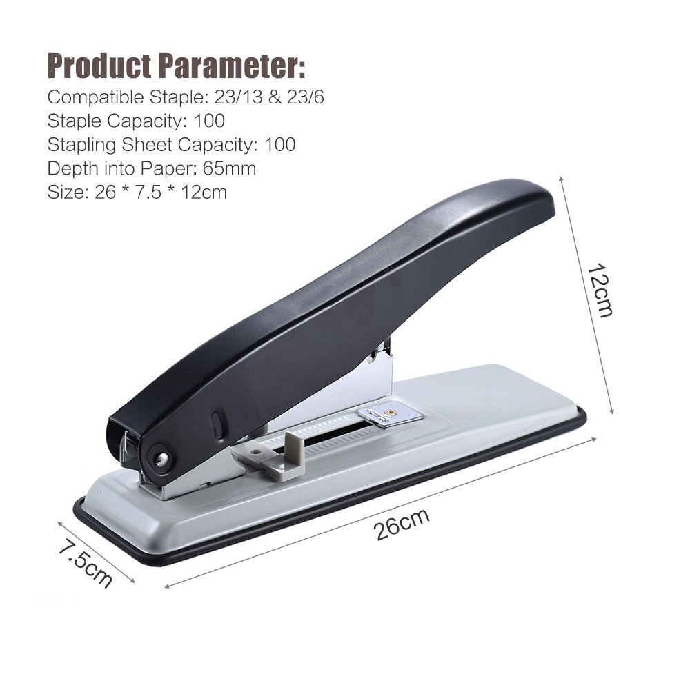 Heavy duty stapler compatible with 23/13 staple uses 23/13 staple, 100 staple capacity, 100 staple processing capacity, staple from the end of paper to 65 mm.