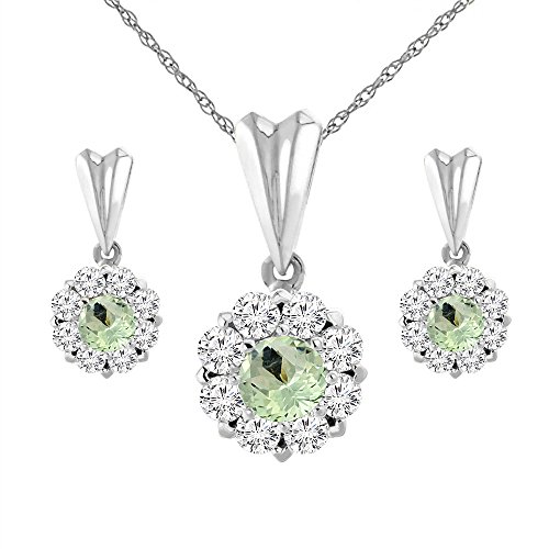 -. Binding : Jewelry -. Brand : Sabrina Silver -. Department : womens -. Feature : 14K Solid Gold / Naturally-vibrant, superior quality color gemstone / High Quality Genuine Diamond Accents / Complimentary gold chain included -. ProductGroup : Jewelry -. ProductTypeName : FASHIONOTHER -. Title : 14K White Gold Natural Green Amethyst Earrings and Pendant Set with Diamond Halo Round 4 mm