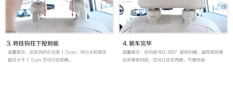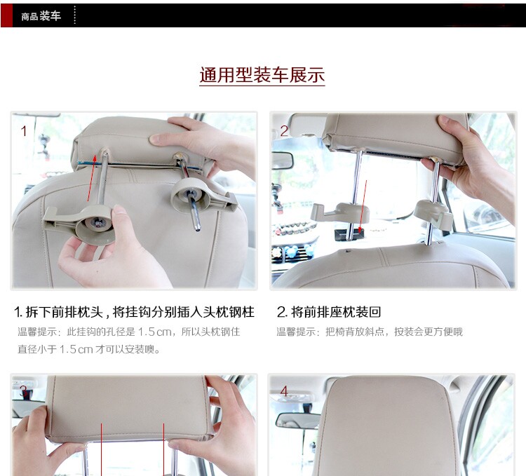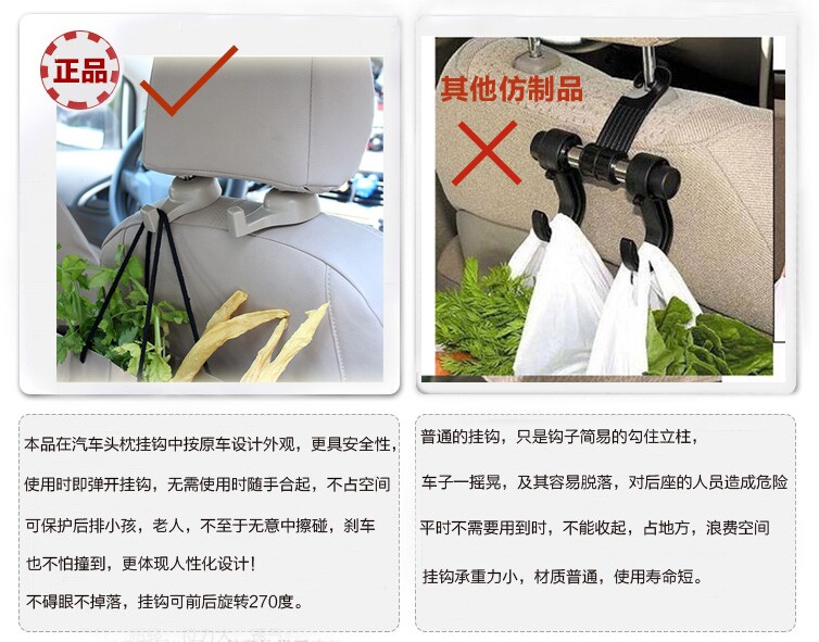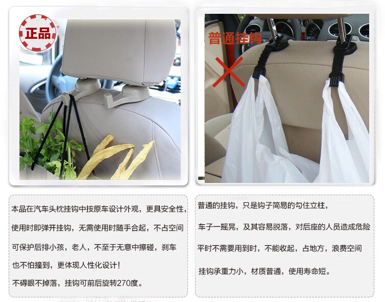 5, this product in the automotive headrest hook according to the original vehicle design,product performance and durability than similar products, more secure, when usingbounce hanging, without the use of hand together, the child not to old insurable,inadvertently rubbing, more humanized design.