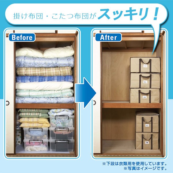 掛け布団や、こたつ布団が入る 圧縮袋と収納ケースが一体になった布団用収納袋 【圧縮袋+収納ケース】 ふとん用(75cm×50cm×25cm) ダウン80%以上の羽毛製品にも使用できます。 スライダー付圧縮袋でラクラク密封 取っ手付きで、持ち運び、出し入れラクラク。 ダニ・カビ・湿気からふとん等を守り、清潔に保存。 サイクロン&循環式掃除機にも対応! <仕様> ふとん用:幅75cm×奥行50cm×高さ25cm (袋サイズ 幅125cm×高さ90cm×マチ50cm) 材質 ポリプロピレン、ナイロン、PVC、ポリエチレン、シリコンゴム セット内容 収納ケース×1,圧縮袋×1,スライダー×1< その他圧縮袋・一緒に使える防ダニシート >