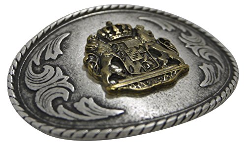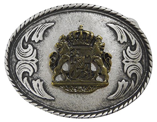 This stylish yet traditional belt buckle comes in an antique silver finish with brass detailing. The oval buckle boasts the Bavarian coat of arms with two lions in brass against a silver-tone background. Suitable for belts that are approx. 1.5' (40 mm / 4?cm) wide. Our buckles are made in Italy and are all of premium quality. - Shipping takes 3-6 days in Europe and generally not more than 8-10 days to non-European countries.