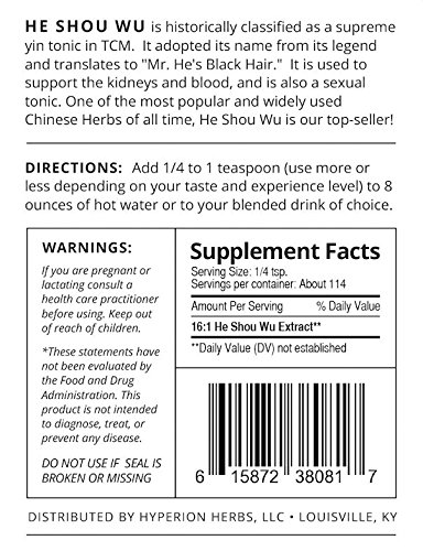 Ingredients: Prepared Organic He Shou Wu Extract* Other Ingredients: None Suggested Serving Size: ½ teaspoon which is about 2 grams 1-2 x a day, or as directed by a health professional Suggestions on usage: This powder can be added directly to smoothies, juices, and protein shakes. The flavor is actually one of the better ones, and would blend well with anything sweet, fruity, or savory. Vanilla undertones give it a versatile and fun base to work with. It is already prepared and ready to consume as is- no heat or stewing necessary. Powdered extracts generally mix more easily in warmer temperatures, but a blender can be used to help incorporate the powder into cooler foods and beverages or simply to ensure a more thorough distribution. *CONCENTRATED EXTRACT: The active constituents are extracted from the herb and then concentrated to a 10 to 1 ratio. GRAY HAIR: The defining factor that He Shou Wu possesses is its ability to maintain natural hair color and even reverse gray hair! This is one of the most popular uses of He Shou Wu, as one study in China showed 89% of the participants to have a portion of their gray hair return to natural color, and of that, 65% were fully recovered. It is important to keep in mind that this study was administered under daily consumption of the herb for several months. According to Dr. Subhuti Dharmananda, director of the Traditional Medicine Institute of Portland: "Healthy hair depends on the sufficiency of blood stored in the liver. When the liver blood is deficient, it is unable to rise and nourish the head; the hair then turns gray or falls out. The health of the kidneys is expressed in the hair of the head, and graying or loss of hair is a sign of kidney deficiency. The teeth depend on the sufficiency of bone matter, which is governed by the kidneys."Feature