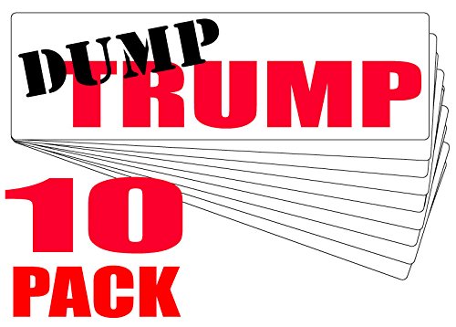 -. Brand : HumperBumper.com -. Feature : 10 x Anti Donald Trump Bumper Stickers 3" x 10" / Made in the USA / UV and water resistant / Will not fade, crack or peel / Will last for years, but will peel off when you need it to without tearing to shreads. -. Label : HumperBumper.com -. Manufacturer : HumperBumper.com -. Model : DEM33x10 -. MPN : DEM33x10 -. PackageQuantity : 1 -. PartNumber : DEM33x10 -. ProductGroup : Automotive Parts and Accessories -. ProductTypeName : AUTO_ACCESSORY -. Publisher : HumperBumper.com -. Studio : HumperBumper.com -. Title : TEN Pack of BUMPER STICKERS: Dump Trump. 3" x 10"
