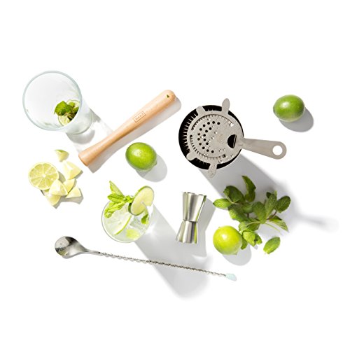 -. Feature : Essential Bar Set includes a muddler, strainer, jigger, stirring spoon, and Boston shaker / Muddler is made of durable beach wood with two working ends / Stainless steel strainer filters out ice, herbs and citrus / Stainless steel jigger has 0.75 fl oz and 1.5 fl oz measurements / Boston shaker is made of a pressed glass base and stainless steel tin
