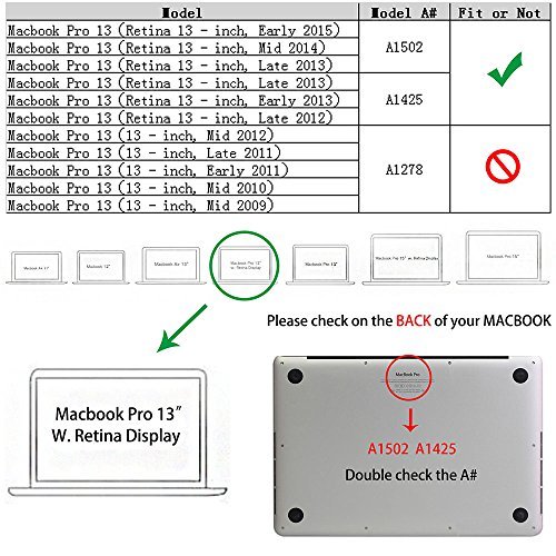 RUBAN High Quality Matte Series Hard Case Case Features: - Great fit for MacBook Pro 13.3" Aluminum Unibody (A1502 / A1425) - Hard Plastic Case with Rubber paint over Top and Bottom Covers for Silky-smooth soft-touch - No cut out design, Apple Logo Shine through the case - Allows you access to all your important plugs and drives while highlighting the unique look of your MacBook Pro 13-inch with Retina Display - Material: Polycarbonate Case Compatible with: - MacBook Pro 13.3" with Retina Display A1502 / A1425 MacBook Pro (13-inch with Retina Display, Early 2015) Macbook Pro 12,1 MF839xx/A, MF840xx/A, MF841xx/A, MF843xx/A MacBook Pro (13-inch with Retina Display, Mid 2014) Macbook Pro 11,1 MGX72xx/A, MGX82xx/A, MGX92xx/A MacBook Pro (13-inch with Retina Display, Late 2013) Macbook Pro 11,1 ME864xx/A, ME865xx/A, ME866xx/A MacBook Pro (13-inch with Retina Display, Early 2013) Macbook Pro 10,2 MD212xx/A, ME662xx/A MacBook Pro (13-inch with Retina Display, Late 2012) Macbook Pro 10,2 MD212, MD213 Case NOT Compatible with: - MacBook 12-Inch with Retina Display (A1534) - MacBook Pro 15-Inch with Retina Display (A1398) - MacBook Pro 15-Inch without Retina Display(A1286) - MacBook Pro 13-Inch without Retina Display (A1278) - MacBook Air 13-Inch (A1369 and A1466) - MacBook Air 11-Inch (A1370 and A1465) Package Includes: - 1 x Matte Hard Case - 1 x Keyboard Skin Cover Friendly Note: In order to ensure that the products will fit perfectly on your laptop, please check the model number before your purchase:) Apple MacBook are registered trademarks of Apple, Inc. Products are Apple compatible and not endorsed by Apple, Inc. 0 |