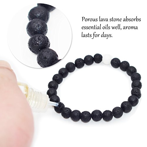 Each bracelet is stringed together by two threads of elastic cords which make the aromatherapy bangle stronger and not easy to be broken. Each stone is selected carefully to ensure the aroma bracelet looks elegant. Black beads are lava stone, white beads are white turquoise (howlite)