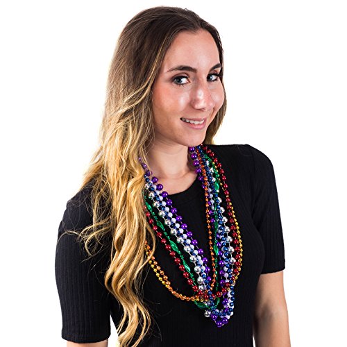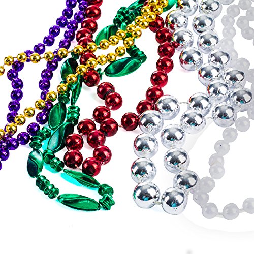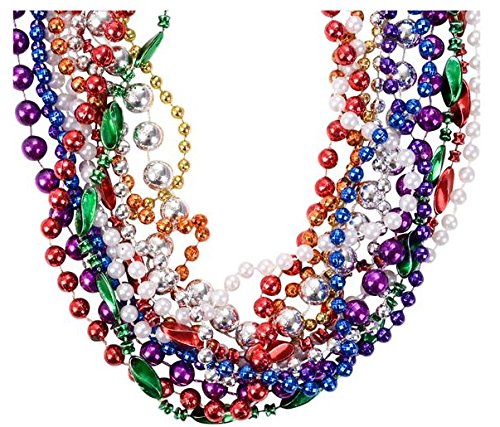 A dozen mixed variety of beads. These bead necklaces are 33" long, vivid colors , different shapes and patterns. Great for Halloween Parties, Dress Up events, carnivals, parades, family get togethers and office parties.