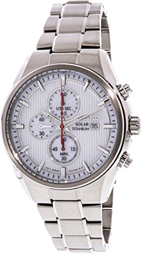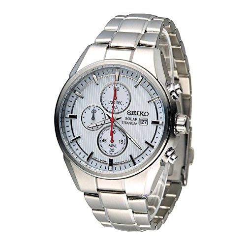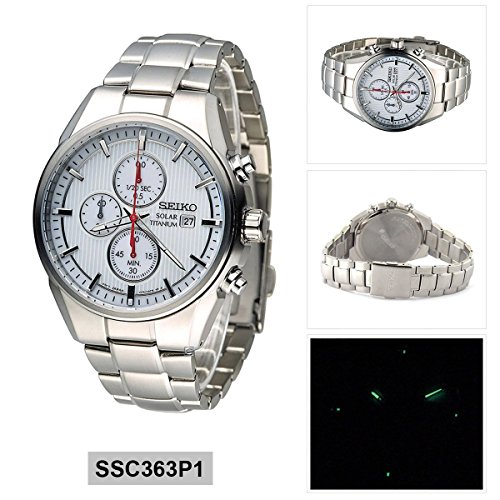 Titanium case with a titanium bracelet. Fixed titanium bezel. White dial with silver-tone hands and index hour markers. Minute markers around the outer rim. Dial Type: Analog. Luminescent hands and markers. Date display at the 3 o'clock position. Chronograph - three sub-dials displaying: 60 second, 30 minute and 1/20th of a second. Solar quartz movement. Scratch resistant mineral crystal. Case diameter: 42 mm. Case thickness: 12.2 mm. Round case shape. Band width: 21 mm. Fold over clasp. Water resistant at 100 meters / 330 feet. Functions: chronograph, date, hour, minute, second. Casual watch style. Seiko Solar Chronograph White Dial Titanium Mens Watch SSC363.Feature