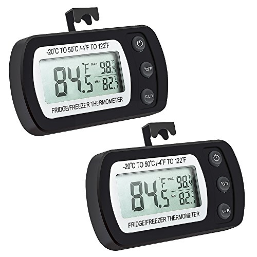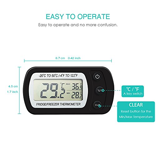 Studio : Oria Publisher : Oria Binding : Kitchen Product Description ORIA friendly design digital freezer thermometer help avoid food spoilage with a thermometer in your refrigerator and freezer. Max/ Min temperature value display on LCD screen, stand for shelf or hang with hook. Specifications: 1. Measuring Temperature Range: -20°C to 50°C/ -4°F to 122°F 2. Accuracy: ±1°C/±2°F 3. Resolution: 0.1°C/0.2°F 4. Waterproof Structure Level: IPX3 5. Operating Voltage: 3V, CR2032 battery, 1PCS 6. Dimensions: 8.7 x 1.2 x 4.5 cm/ 3.4 x 0.5 x 1.8 inch 7. Weight: 45.4g Package Contents: 1 x User Manual 1 x Refrigerator Thermometer?(Battery Included) Note: ● Press the CLR button, the MIN/MAX readings will be reset. ● Please reboot it if you find inaccurate info. ●?How to replace the battery Replace the battery when the reading becomes erratic or the display clarity fades. Open the screw and the ABS shell, and replace with a new CR2032 battery which you can easily get from store. Warranty Guarantee: - 24/7 Customer Service - 12-Month Replacement Warranty - 60-Day Money Back Guarantee Please contact us directly if need any help GCID: ORIA 0 |