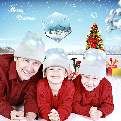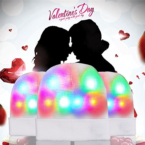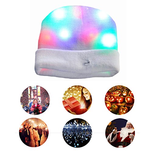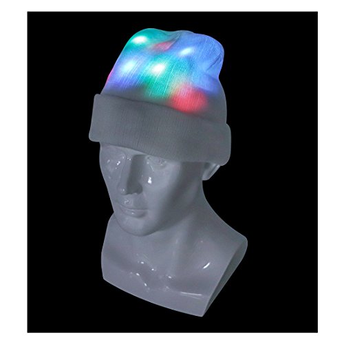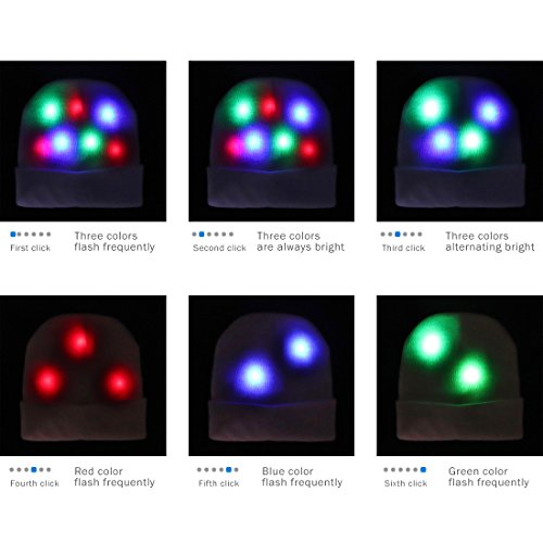 FEATURES - This LED beanie cap can keep you warm and bright. - Features red, green, and blue LED lights with 6 different flash modes. - It fits ifferent age groups. - Hidden battery box and switch label makes the hat not only beautiful but also easy to use. - You can easily remove the insulating piece, then press the switch button which is on the battery box in oder to realize lighting mode switches.