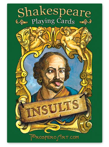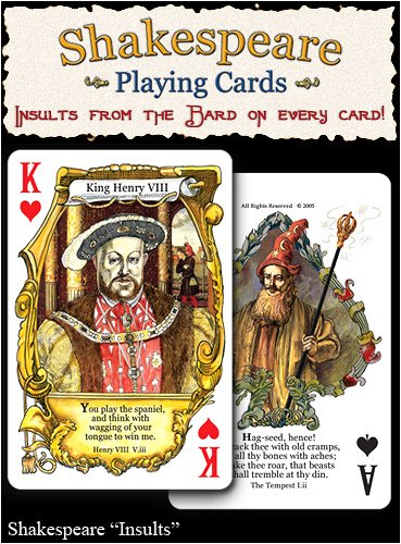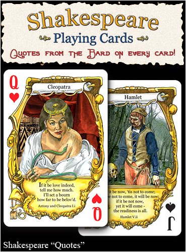 Studio : Prospero Art Publisher : Prospero Art Binding : Sports Product Description Shakespeare "Quotes" Playing Cards has a different quote from Shakespeare on each card, and every play by Shakespeare is quoted. Quotes on all of the number cards contain a reference to that number in the quote. In addition, each of the four suits of the deck represent a different dramatic temperament, with all of the heart card quotes representing themes of love and romance, diamonds: wealth, spades: intrigue and the clubs: war. 0