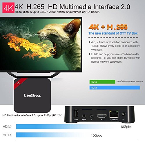 -. Feature : Leelbox Q1 Miracast 4K*2K KODI 16.0 version, Ethernet:10/100M, standard RJ-45, Free Internet searching,thousands of android applications,many kinds of games,etc. / Leelbox Q1 is a smart Streaming Media Player with Rockchip RK3229 Quad-core Cortex A7 Chipset,up to 1.5GHz 64bit 64bit Miracast 4K*2K Media Player Penta-Core GPU / Leelbox Q1 RAM: DDRIII 1GB; ROM: Flash 8GB,Expand Memory: SD/SDHC/MMC cards (Maximum support 32GB) / Leelbox Q1 64 Bit:Rockchip RK3229 Quad-core Cortex A7 solution, the MOST professtional Quad core CPU performance for Network TV Box. Full Quad core,1.5GHz Ultra high frequency,more than 4 times performance improvements. / Leelbox Q1 package include: 1* Q1 TV Box(1G/8G), 1*Remote control, 1*Power Supply, 1*HDMI Cable, 1*User Manual