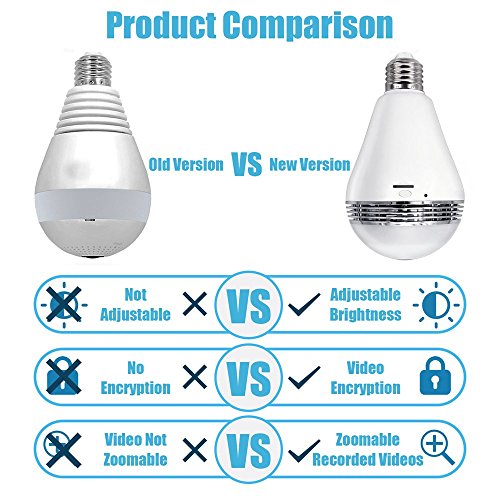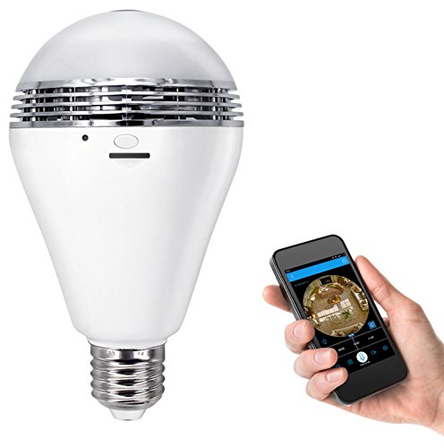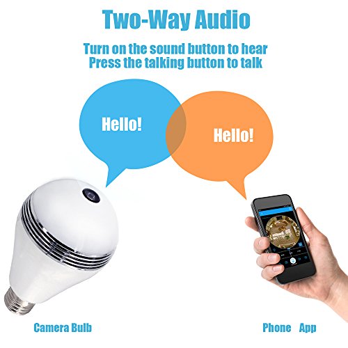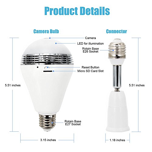 Feature: 1. 360-degree fisheye lens will provide you with great wide view angle, monitoring your place with no blind area. 2. Remote real-time video, playback, alarm push, never miss any moment. 3.Dimmable control makes it a smart bulb, including two control modes. 4. Motion detection: Whenever any motion is detected, security system will send alert on user's mobile phone immediately. 5. Voice intercom enable it become one good communication tool for you to communicate with families, friends and your pets freely. 6. Easy to use: Quick Wi-Fi setup via iOS or android smartphone app, you can view hd video anytime from your smartphone app. 7. Video encryption: Security system will encrypt the micro sd card which makes the video files unable to be read on the other electronic devices. Video can be only browsed by smartphone via app, protecting your video files. Specification: Size: Diameter 3.15 inch, height 5.51 inch net weight: 136g gross weight: 419g power port: E26/e27 power supply: Ac 100~240v camera lens: 360°panoramic perspective 1/3" fisheye lens video code: H.264 video storage: In tf memory card(up to 128g), tf card not included loop recording: Yes resolution: 1280 x1024(1.3mp) frame rate: Maximum 25fps package included: 1 x ec-29 ip camera bulb 1 x user manual 1 x tool accessories (adjustable connector) notice: 1. If camera bulb can not connect Wi-Fi , please press the reset button until the camera have voice prompt, then it will be easy to connect Wi-Fi. 2.This camera bulb is a light camera bulb, which has no infrared function. Light needs to be turned on when monitoring in the darkness at night. 3. Tf card is not included and the camera can not support 5g Wi-Fi.Feature