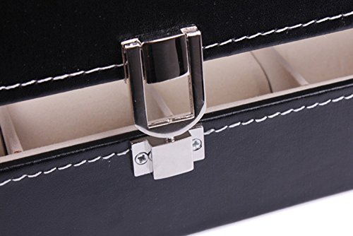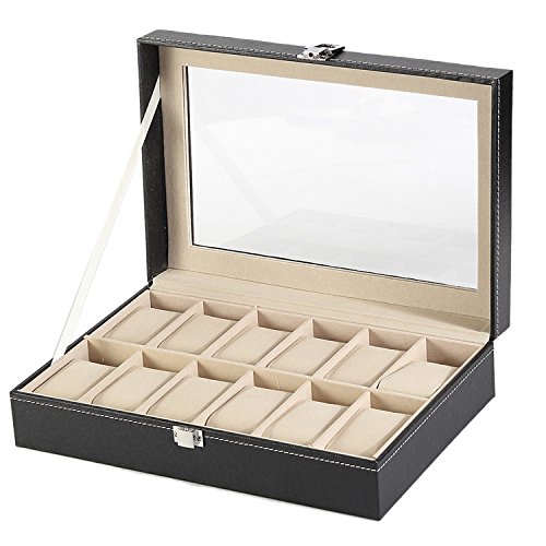 -. Feature : HIGH QUALITY & FANTASTIC LOOK: Made from good quality black PU leather cover, well-done seams, refined interior, smooth actual hinge, see-through real glass top, this well-built watch box is sturdy as well as elegant. Your beloved must be very happy when receiving such a nice gift at birthday or Christmas / LARGE REAL GLASS LID: Real glass lid keeps your watches from dust, and offers you an open view of the displayed watches. This watch box, with real glass window, is able for you to see all the watches in the box and help you decide quickly which watch to wear. It will display all your watches in a convenient, fashionable and clear way / HIGH QUALITY PILLOWS & FIT FOR VARIOUS WATCH STYLES AND SIZE: Made of high quality velvet and sponge cushions, in deformable & soft, protect your watches from dust, damp and shock perfectly. The flexible velvet squares are large enough to fit men's giant wrists, but also pliable enough to accommodate women's daintier jewelry if need be. / COMPACT BODY: If your large collection of watches is making a mess in your room, place them all in this conveniently sized organizer box; Your collection will be stylishly displayed and organized at the same time without creating a clutter / SOLID WOOD CONSTRUCTION: Made with high quality care and constructed to be strong and durable - Perfect vintage-style watch box for any watch enthusiast!