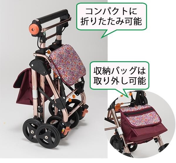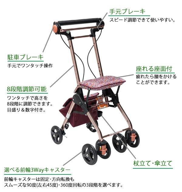 | 軽量&スタイリッシュ&コンパクトなシルバーカー。手元ブレーキ、座れる座面、取り外し可能な収納バッグ、杖・傘立てなど、あるとうれしい機能を搭載!!ショッピングやお散歩、バス等の交通機関に乗る際も、ラクラク便利にご使用いただけます♪ |