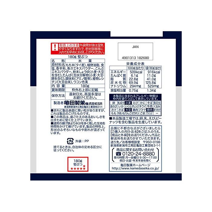 원재료:찹쌀(타이산)고, 식물성 기름지,식염,향신료,생선 및 조개류 엑기스 파우더,다시마 엑기스 파우더,분말 간장(밀 대두를 포함한다)고, 담백 가수분해물(밀 대두돈을 포함한다)고, 조미료(아미노산등)고, 식물 레시틴(대두 유래)고, 《우콘》색소