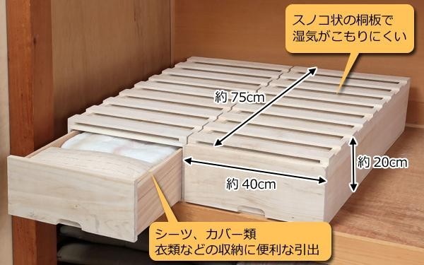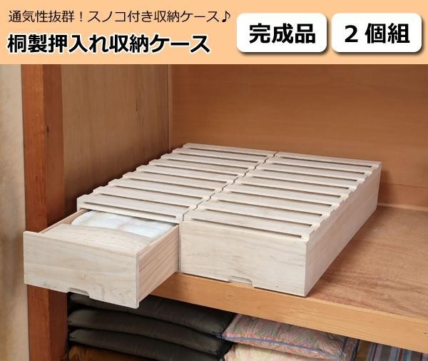 押入れの奥までたっぷり収納できる桐製の収納ケースです。重ねても並べても使用できるので、押入れ内のデッドスペースも有効活用できます。本体上部はスノコ状で、上にお布団などを置いても湿気にくい構造になっています。完成品でのお届けですので、届いたらすぐにお使いいただけます。 |