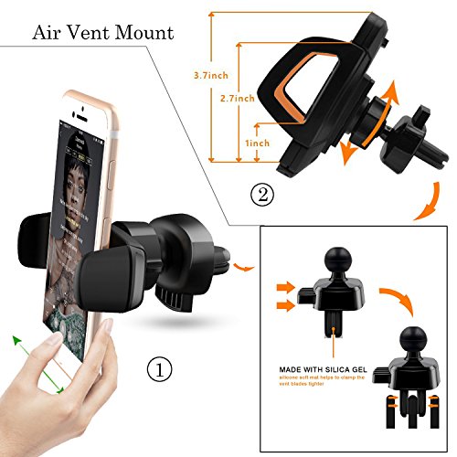 ◆【Air Vent Phone Holder】: Universal air vent phone holder can be mounted to air vent car outlet. Double springs base clipped to the outlet fan, no fall. Built-in safety elastic cotton so you do not have to worry about your car air vents will be damaged.