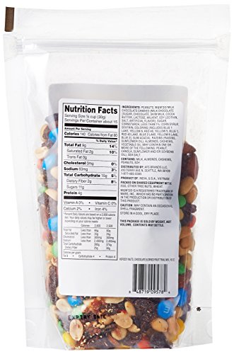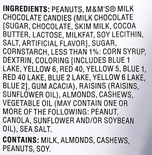 - Mix includes peanuts, M&M’s, raisins, almonds, cashews