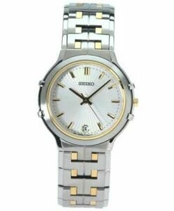 Seiko Sonata Stainless steel case (38mm) and bracelet with 18K gold accents deployment buckle Hardlex crystal white dial gold tone hands and stick hour markers second hand date at 6:00 water resistant up to 50 meters approximately 5 year battery life quartz m