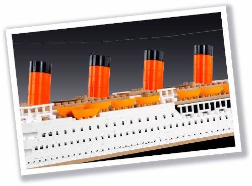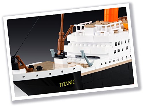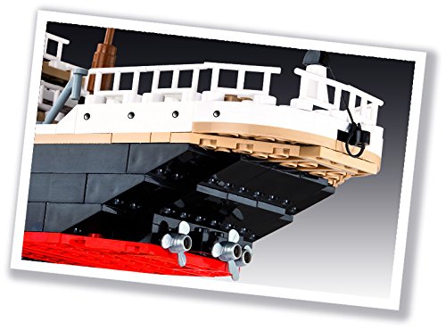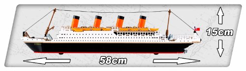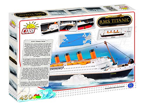 The Titanic model was specially designed and manufactured to honor the 100th anniversary of Titanic maiden voyage. Our designers worked on every detail to create a perfect reflection of this magnificent ship. As the original, the COBI ship has 4 chimneys, numerous decks, lifeboats, masts, and rotating turbines. Additionally, there is a possibility of installing wheels which enable you to play with the ship on the floor. The set contains 450 elements. After being built, the model is almost 40 inches long and 6 inches high. This item is a great addition to the extended COBI Action Town collection!.Feature