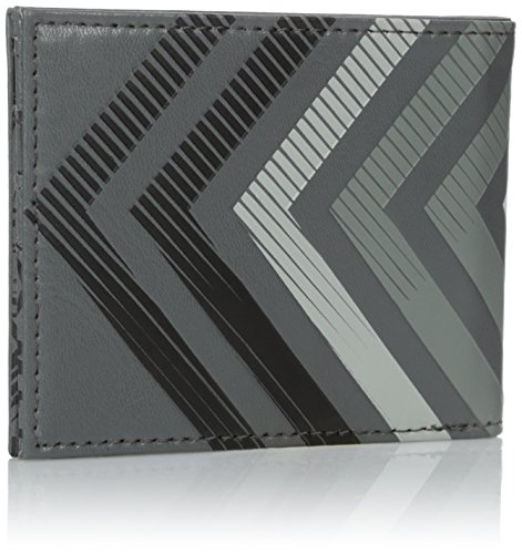 100 percent faux leather, charcoal grey, bi-fold wallet, large debussed and printed chevron logo, branded allover print at interior of wallet. 8.5 with x 3.25 h