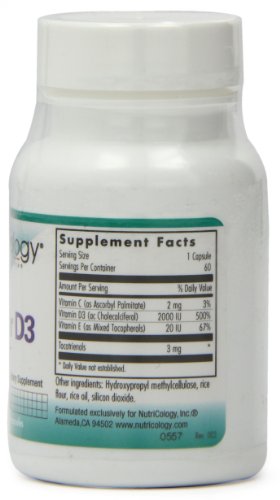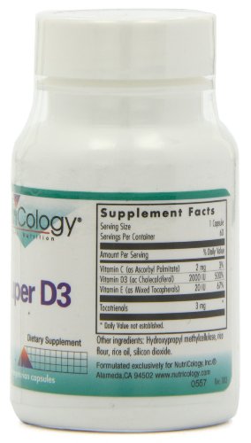 Studio : Nutricology Publisher : Nutricology Binding : Health and Beauty Product Description Product Information from Nutricology Innovative Nutrition Now In Vegicaps Dietary Supplement Super D3 Vitamin D3 supports calcium metabolism and absorption. Suggested Use As a dietary supplement, 1 capsule daily, or as directed by a healthcare practitioner. Supplement Facts Supplement Facts Serving Size: 1 Capsule Servings Per Container: 60 Vitamin C (as Ascorbyl Palmitate) 2 mg 3% Vitamin D3 (as Cholecalciferol) 2000 IU 500% Vitamin E (as Mixed Tocopherols) 20 IU 67% Tocotrienols 3 mg Daily Value not established Other Ingredients Hydroxyprop 0