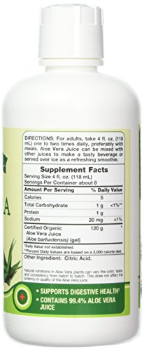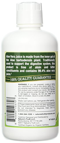 -. Binding : Health and Beauty -. Brand : Nature's Truth -. EAN : 0840093103703 -. Feature : Supports digestive health / Promotes regularity / Unflavored, though not unpleasant in taste -. IsAdultProduct : 0 -. Label : Piping Rock Health Products -. Manufacturer : Piping Rock Health Products -. NumberOfItems : 1 -. PackageQuantity : 1 -. ProductGroup : Health and Beauty -. ProductTypeName : HEALTH_PERSONAL_CARE -. PublicationDate : 2017-02-19 -. Publisher : Piping Rock Health Products -. ReleaseDate : 2017-02-19 -. Studio : Piping Rock Health Products -. Title : Nature's Truth New Organic Aloe Vera Juice, 32 Fluid Ounce -. UPC : 840093103703