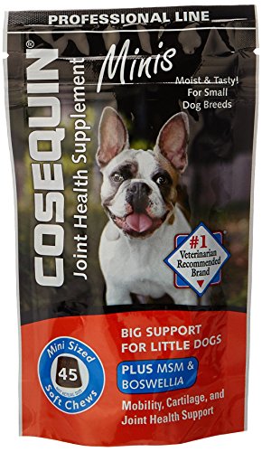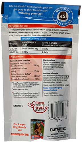 Each bag contains 45 tasty mini sized soft chews formulated to help meet the needs of dogs under 25 pounds. Softer, easier to administer alternative to chewable tablets for even the most finicky dog. Moist and tasty. Use cosequin to help your pet climb stairs, rise and jump!
