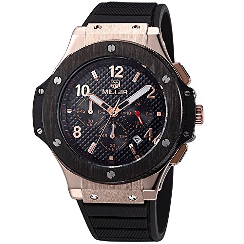 -. Feature : Stainless steel back cover and alloy gold case, black silicone strap. / Quartz movement for accurate time keeping / 3 sub-dials are for chronograph second,chronograph minute and 24 hours function. / Analog display with calendar date / 30m (99 ft) daily water resistance (not for showering and swimming).