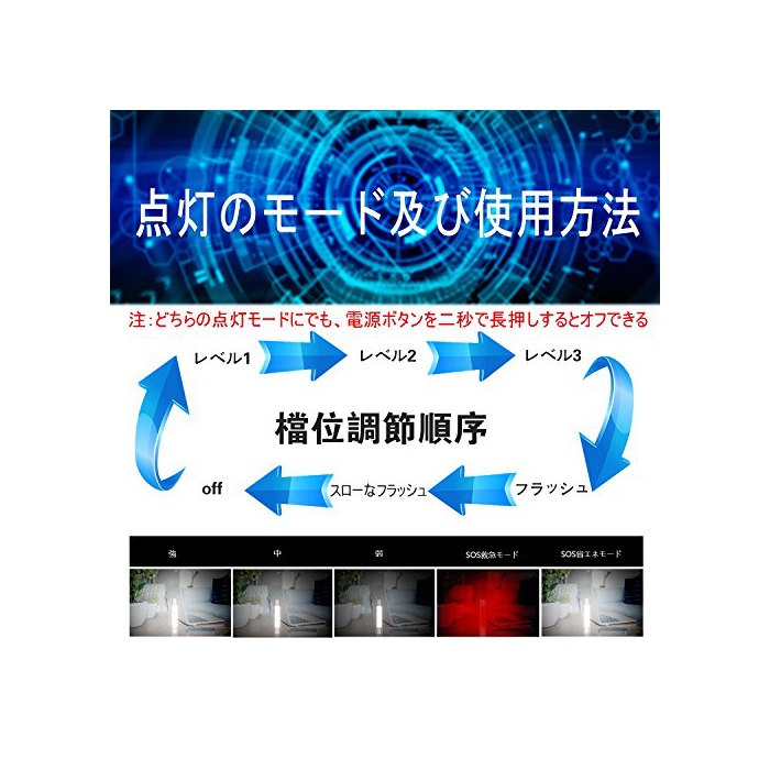 ▶4 「밝기는 5단계에 조절 가능」 점등 모드는 5패턴:강하다→중→약→SOS구급 플래쉬《라》(빨강과 흰색의 빛이 점멸한다)→빨간 라이트→끄는 입니다.자유롭게 좋아하는 밝기를 조절 하고, 눈(째)로도 친절합니다.본체로 붙인 버튼에 바꾸는 것 를 할 수 있습니다.(주:어느 쪽의 점등 모드에나,전원 버튼을 2초에 길이 누르기하면 오프 할 수 있는)
