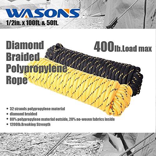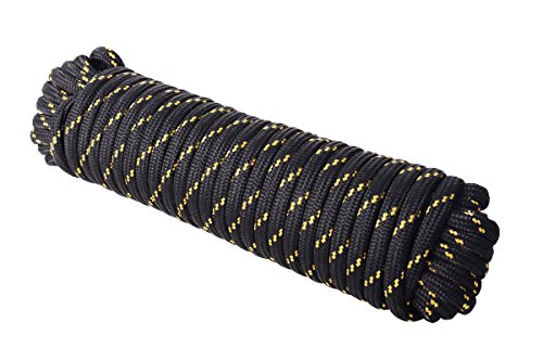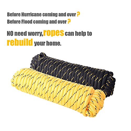Utility Rope, Paracord rope Twist , Sisal Jute , 1/2-Inch by 50 and 100 Feet, Hank package Braided Polypropylene General Purpose Diamond braided 32 Strands Rope (1/2 by 100FT, Black with 2 yellow)