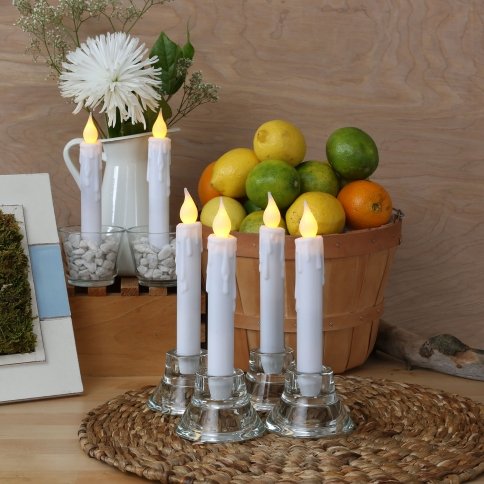 - Feature : Set of 6 White Resin Drip Taper Candles / Each Candle Measures 7" H; Fits into standard candle holders / Requires 2 x AA batteries per candle (not included) / Auto timer feature: 6 hours on 18 hours off / Suitable for indoor and outdoor use