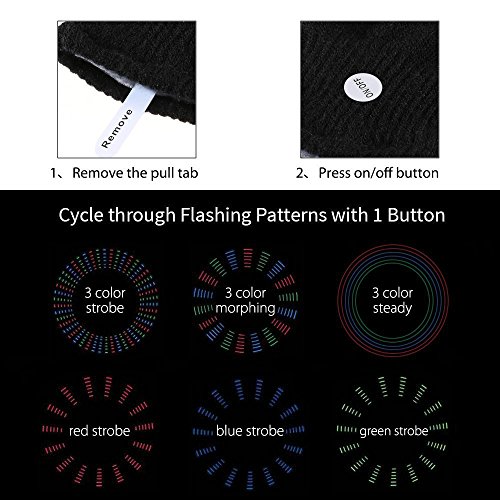 6 Flashing Modes 3 color strobe, 3 color morphing, 3 color steady, red strobe, blue strobe, green strobe. You can cycles through 6 light modes by a button on the wrist. The battery pack comes with the batteries already installed with a pull tab to ensure that they are not wasted prior to you getting the product.Remove from battery pack and press the on/off buttuon to light up gloves.