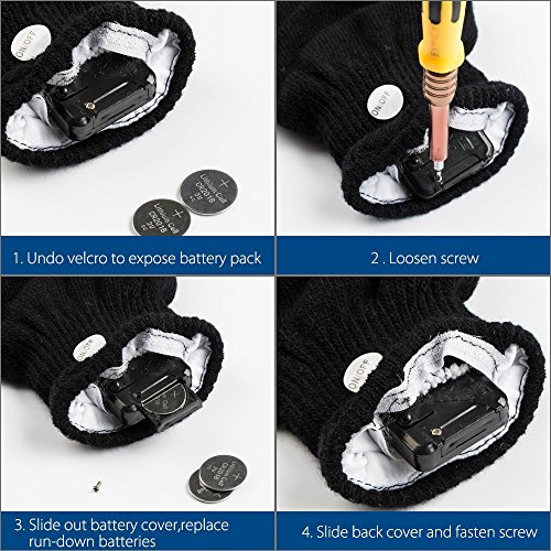 Ther are two cell batteries per glove . Ready to use straight out of the package. The battery and on-off switch is inside a little pouch on the gloves, which is kept closed with velcro. After the battery died, you could replace with two CR2016 batteries. 0 |