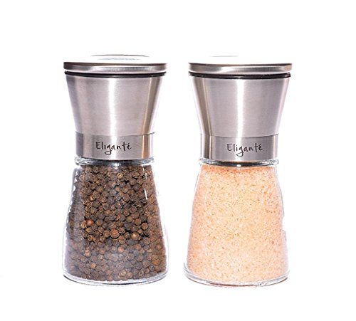 Eligante Premium Salt and Pepper Grinder Set - Stainless Steel Salt and Pepper Shakers with Glass Body and Adjustable Coarseness Ceramic Mill with Stand - Combo Set of 2