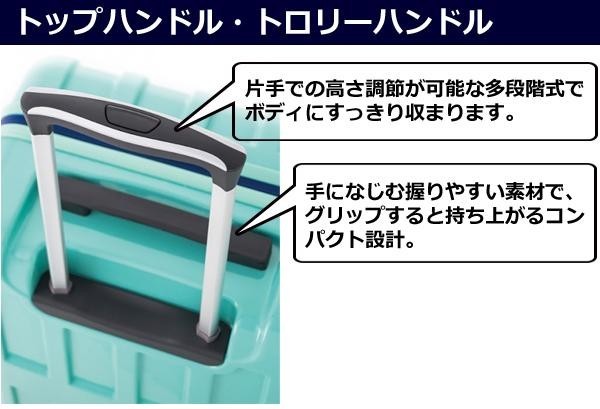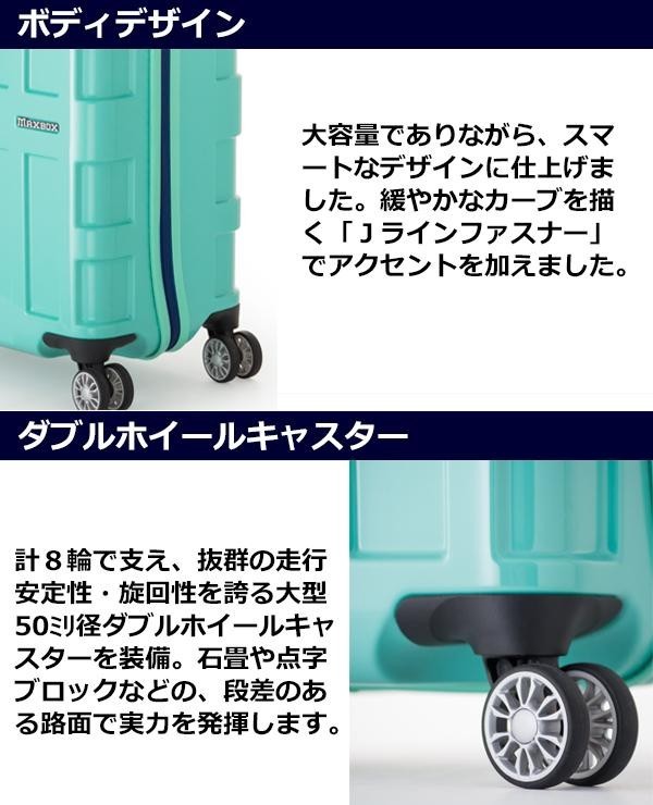 3辺合計114cmで、国内線座席数100席以上の航空機に持込可能です。大型50mm径ダブルホイールキャスターを計4輪装備し、抜群の走行安定性・旋回性を誇ります。スマートなのに40Lの大容量!!ファスナーは、破損しにくいボディ埋め込み式ファスナーロックです。 |