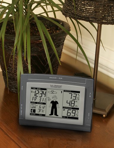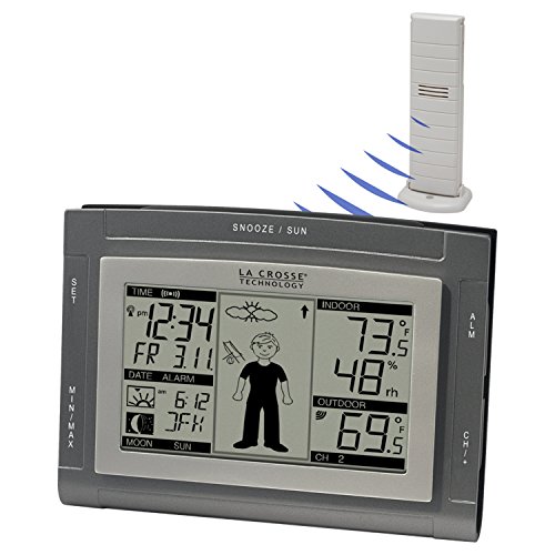 The Wireless Weather Station with Sun/Moon and Advanced Forecast Icons from La Crosse Technology features atomic time and date, 15 weatherman forecast icons based on temperature and air pressure readings that suggest what kind of weather to expect and what to wear and twelve moon phase icons. Wirelessly monitor indoor and outdoor temperatures and sunrise and set times with the WS-9611U-IT-CBP.