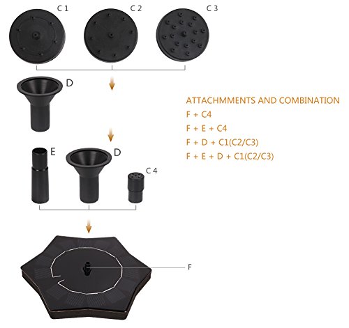 - ❤ Four different spray heads --- There are 4 different spray heads, every spray head has a different spray. You can easily change the spray head. This is a floating water fountain pump, but if you don't want it floating everywhere, you can also use the suction cup to secure the pump.