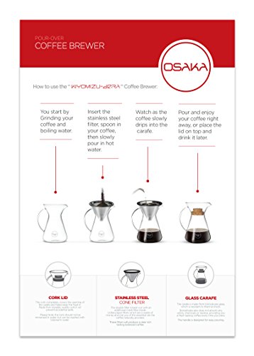Dishwasher Safe, The Carafe is microwave safe but not the filter. Avialable in 20 oz. and 30 oz."Osaka"what does it mean? Osaka, is a large city on the Japanese island of Honshu, and is known for its modern architecture, boisterous nightlife and delicious coffee shops. We were inspired by their coffee brewing techniques, and from that "Osaka Coffee" was born. Every one of our products will look good enough to display, and will perform better than anything else. If you are not yet in love with the process of coffee-making, be prepared to be infatuated. 0