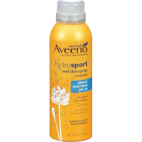 Aveeno Hydrosport Wet Skin Sunscreen Spray, 5 Ounce -- 12 per case. Broad spectrum sun protection that can be applied directly to wet skin. AVEENO HYDROSPORT Wet Skin Spray Sunscreen with Broad Spectrum SPF 30 harnesses the unique water repelling ability of ACTIVE NATURALS Lotus Complex, a special blend with naturally derived ingredients. This exclusive formula provides superior sun protection and withstands wear off from water and sweat. Lightweight and nongreasy, this revolutionary sunscreen forms a thin, breathable shield which clings to skin, even when its wet.