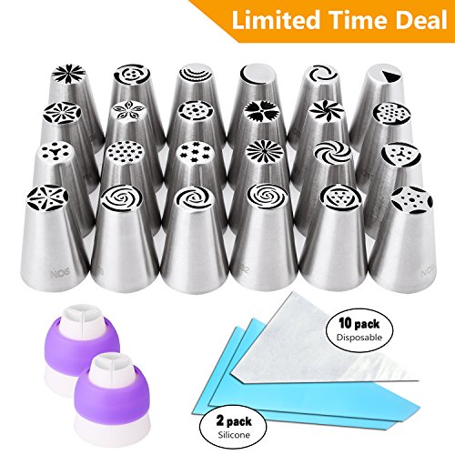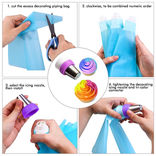Perfect Cakes Icing Decoration Set: the contents include 24 stainless steel pastry piping tips(include I leaf tip), 2 Three-Piece coupler, 10 pastry bags and 2 silicone bags. No need to purchase extra baking supplies.