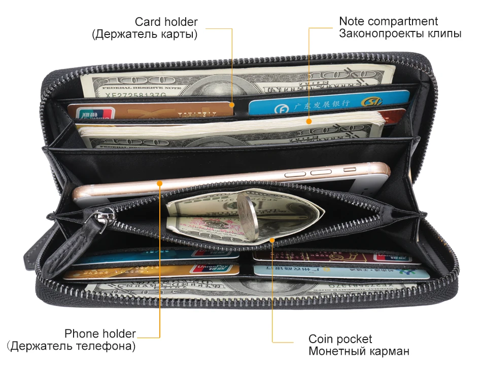 Capacity:Large capacity, phone, cards, money, coins etc.
