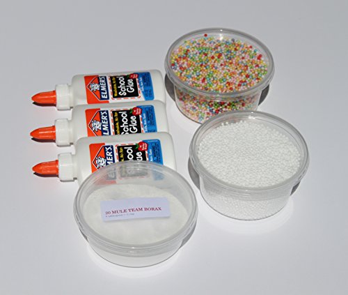 QUALITY PRODUCT - Foam balls are made from virgin polythyene. Those full expanded foam ball beads are perfect for slime. Assorted color foam balls will not leak any color. Kits also includes Elmer's School Glue and 12 MULE TEAM Borax