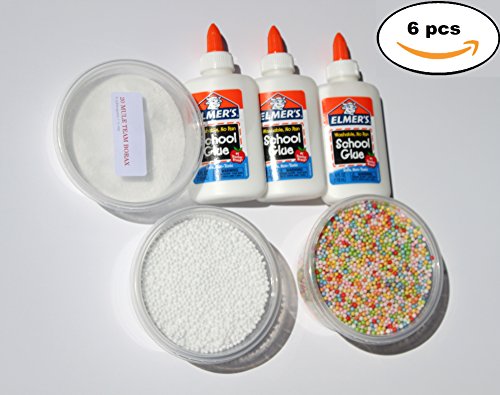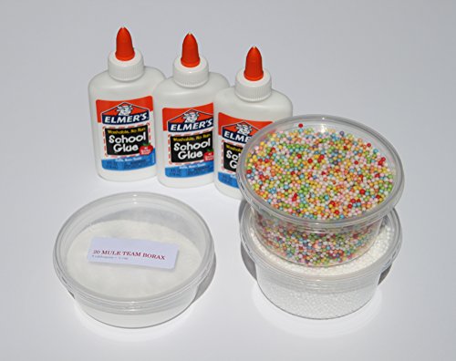 Foam Slime Starter's Kit Combo Includes 3 Elmer's School Glue Half a Cup 4 OZ Borax 12 OZ White Foam Ball and 12 OZ Assorted Mixed Rainbow Color Foam Ball