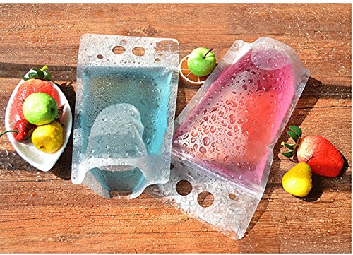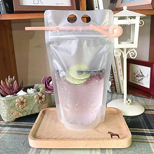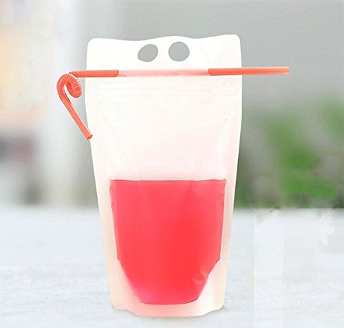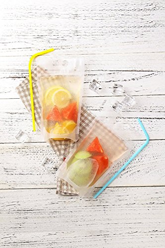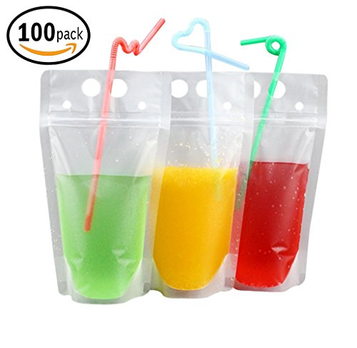 100 PCS Clear Drink Pouches Bags Heavy Duty Hand-held Translucent Reclosable Zipper Stand-up Plastic Pouches Bags Drinking Bags 2.4" Bottom Gusset with 100 Straws