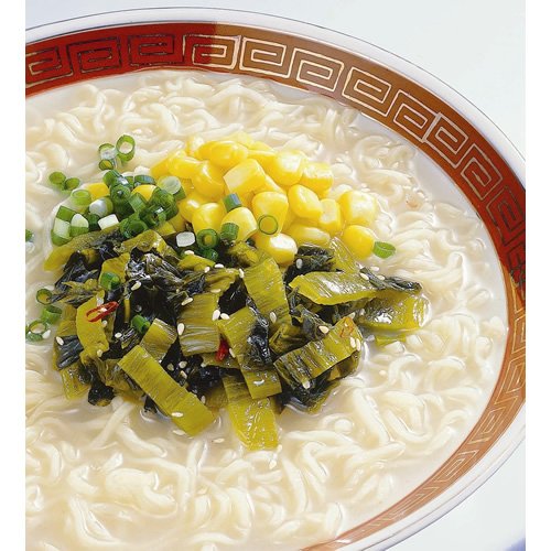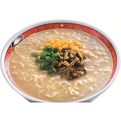 めんは3分調理のコシのある若干細めのめんです。スープはポークエキスをベースに玉ねぎ等香味野菜をブレンドした濃厚感とコクのあるとんこつスープのラーメンです。また、別添にてとんこつラーメンのトッピング具材として人気のある、ピリッと味わい深い九州産辛子高菜(レトルトタイプ)をつけております。