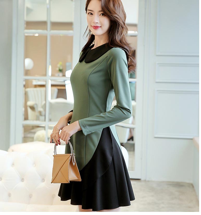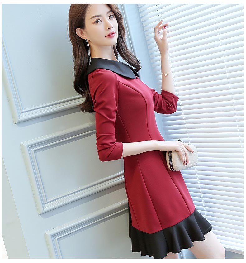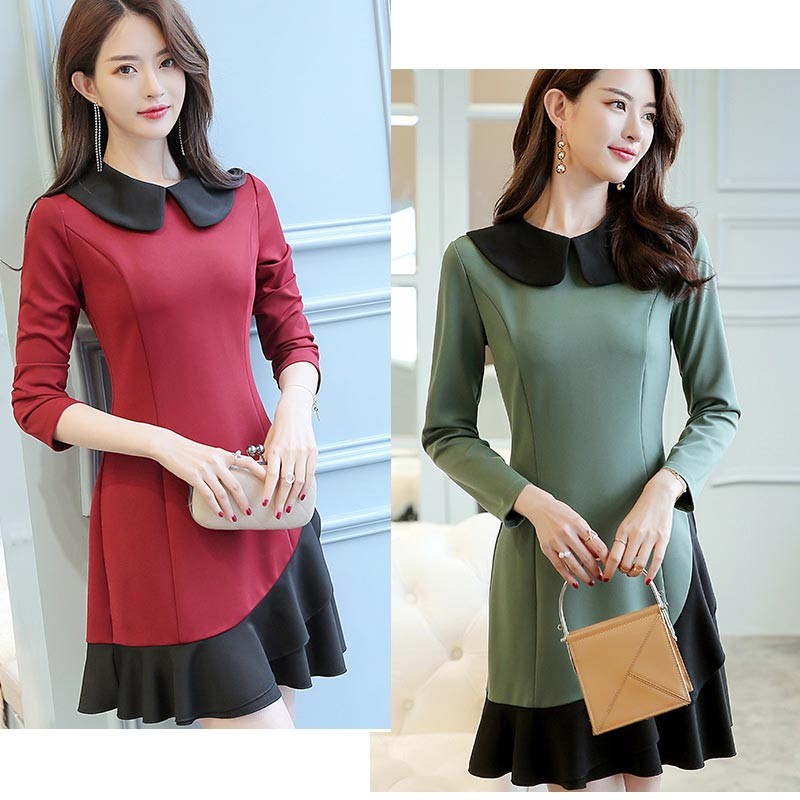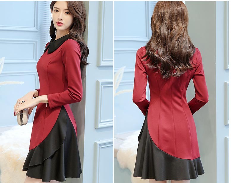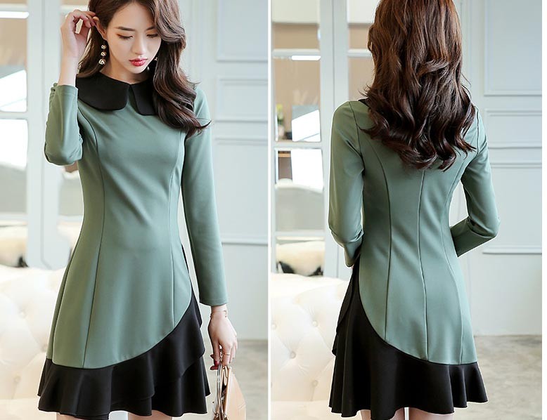 ブラックの大きめの襟と裾2段フリルデザインの長袖バイカラーワンピース♪