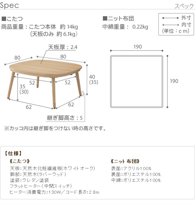 幅80x奥行80x高さ35/40cm(継脚5cm)
